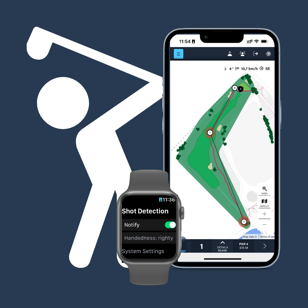- Rangefinder- Du erhältst exakte Entfernungen zum Grün (Anfang, Mitte, Ende) – sowie die Entfernungen vom Abschlag und die zu deinem letzten erkannten Schlag.